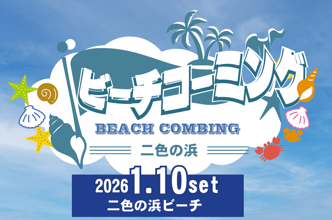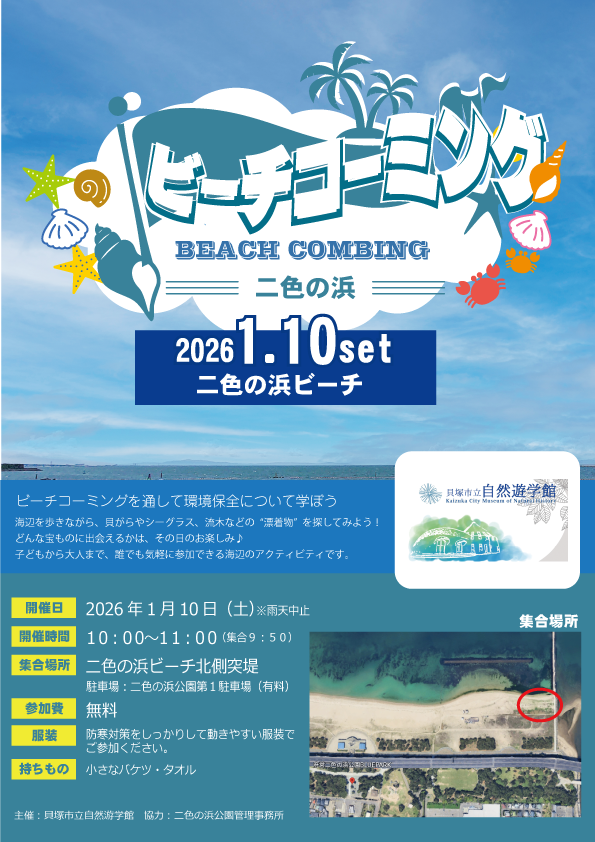 2026 1/10 1/10(土)ビーチコーミングを通して環境保全について学ぼう 開催日 2026年1月10日(土)※雨天中止 開催時間 10:00~11:00(集合9:50) 集合場所 二色の浜ビーチ北側突堤 駐車場:二色の浜公園第1駐車場(有料) 参加費 無料 服装 防寒対策をしっかりして動きやすい服装でご参加ください。 持ちもの 小さなバケツ・タオル海辺を歩きながら、貝がらやシーグラス、流木などの“漂着物”を探してみよう!どんな宝ものに出会えるかは、その日のお楽しみ♪子どもから大人まで、誰でも気軽に参加できる海辺のアクティビティです。 Post Share Hatena Line RSS feedly Pin it note イベント一覧