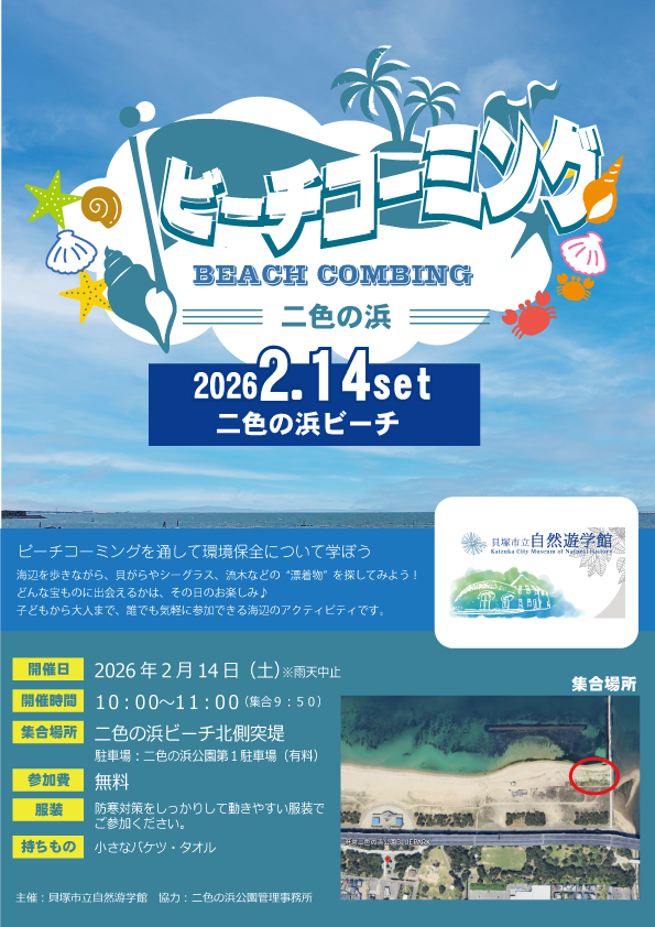 | 集合場所 | 二色の浜ビーチ北側突堤 駐車場:二色の浜公園第1駐車場(有料) |