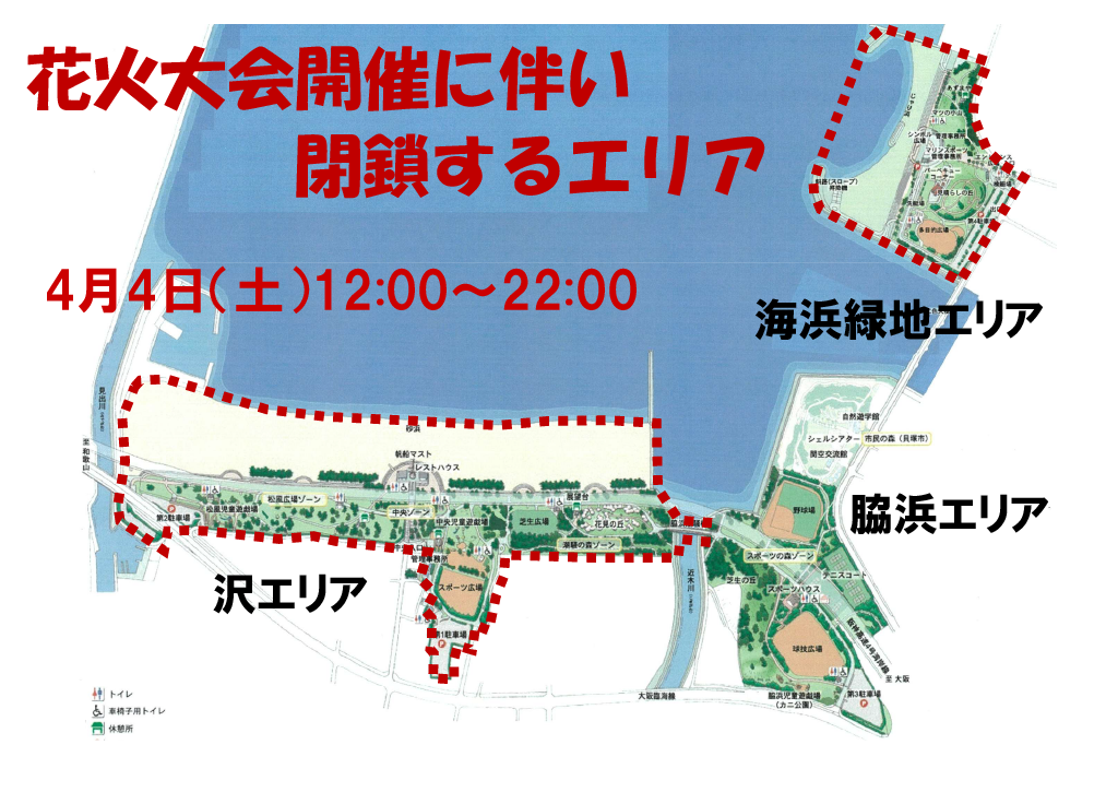 令和8年4月4日(土)【JAPAN FIREWORKS EXPO2026 in Osaka-Nishikinohama】 の開催に伴い、下記の期間、公園の各施設を閉鎖させていただきます。